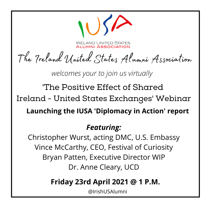 The IUSA are delighted to invite you to ‘The Positive Effect of Shared Ireland – United States Exchanges’ webinar where we are launching the ‘Diplomacy in Action’ report. Join us online, Friday, April 23rd, from 1-1.30 P.M. for a lunchtime event that highlights the report’s key findings and celebrates their impact on U.S. – Irish relations.